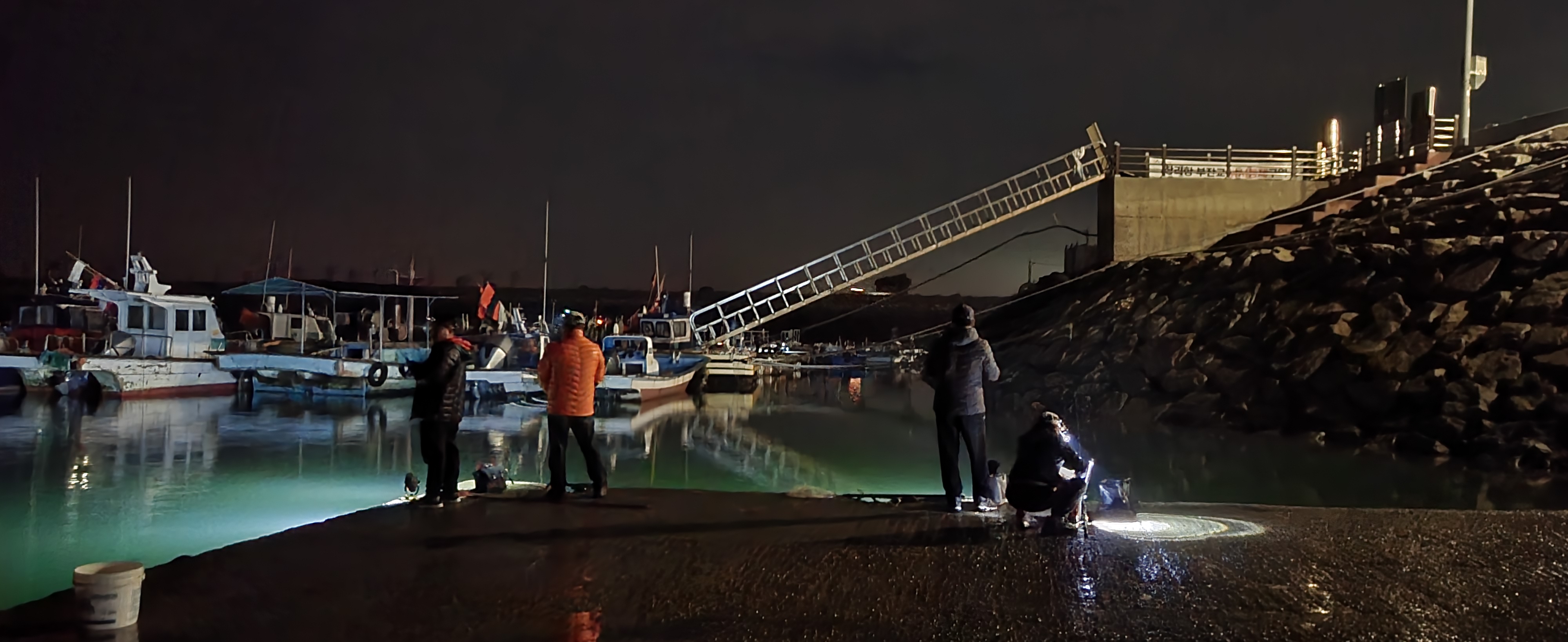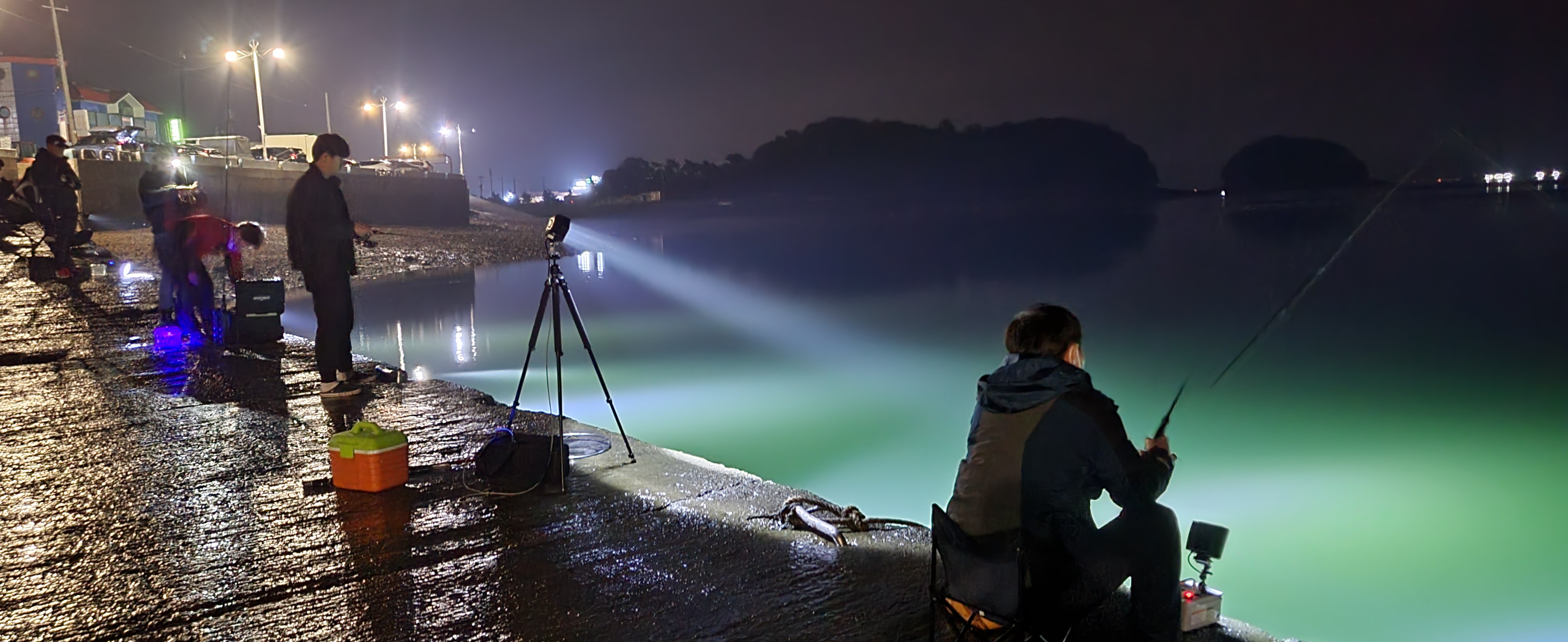 10월 창리포구의 밤에는 워킹낚시를 즐기러 오신 분들이 선착장을 가득 메우고 계셨다. 물이 빠짐에 따라 점점 아래로 내려가면서 갑오징어를 기대하시는 듯. 충남 서해안권에서 갑오징어를 워킹낚시로 잡는 곳이라 소문이 나서 그런지 밤 늦도록 조사님들이 계속 오셨다.