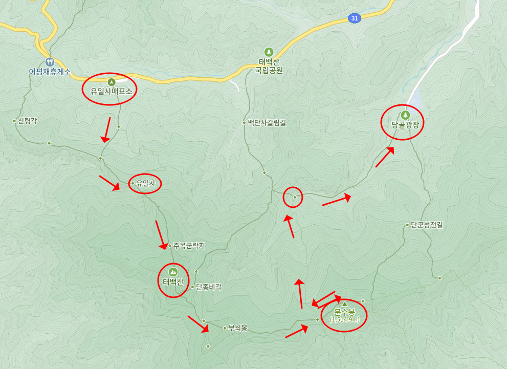 유일사 주차장(매표소) - 유일사(쉼터) - 태백산 정상(장군봉) - 천제단 - 문수봉 갈림길 - 문수봉 - 문수봉 갈림길 - 합류지점 - 태백산 눈꽃 축제장 - 당골광장